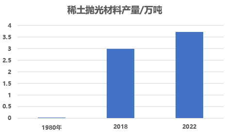 20世紀(jì)60年代開始,中國(guó)就開始大量生產(chǎn)稀土拋光粉,主要以混合稀土拋光粉、石膏石和純氧化鈰等為原料。到了 20 世紀(jì) 70 年代,稀土拋光粉已經(jīng)代替了常規(guī)的氧化鐵,用于玻璃打磨。20世紀(jì)90年代,中國(guó)稀土拋光粉材料的制備、應(yīng)用以及生產(chǎn)技術(shù)方面都獲得了長(zhǎng)足的發(fā)展。稀土拋光材料領(lǐng)域出現(xiàn)了從傳統(tǒng)玻璃表面加工到光電子顯示產(chǎn)品的新發(fā)展,從傳統(tǒng)應(yīng)用到光電高科技應(yīng)用的改進(jìn)。在產(chǎn)量方面,國(guó)內(nèi)稀土拋光材料的應(yīng)用從20世紀(jì)80年代的不到40噸增加到2018年的3萬(wàn)噸左右。2022 年,我國(guó)稀土拋光材料產(chǎn)量達(dá)到 3.73 萬(wàn)噸,居世界第一。
