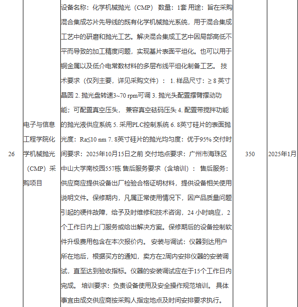 近日,中山大學(xué)發(fā)布38項儀器設(shè)備采購意向,預(yù)算總額達(dá)0.96億元,涉及微區(qū)原位場發(fā)射測量系統(tǒng)、電子束光刻機(jī)、等離子體深硅刻蝕系統(tǒng)(ICP)、手動式曝光機(jī)、共濺射磁控濺射系統(tǒng)、光芯片自動耦合升級的掃譜系統(tǒng)等,預(yù)計采購時間為2024年12月~2025年1月。其中,電子與信息工程學(xué)院進(jìn)行化學(xué)機(jī)械拋光的采購,旨在采購混合集成芯片先導(dǎo)線的既有化學(xué)機(jī)械拋光系統(tǒng),用于混合集成工藝中的研磨和拋光工藝,解決混合集成工藝中因局部高低不平而導(dǎo)致的加工精度問題,實現(xiàn)基片表面平坦化,也可以用于銅金屬以及低介電常數(shù)材料的多層布線平坦化制備工藝。