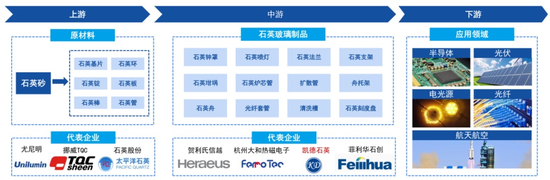 完整的石英玻璃產業鏈包含從高純石英砂原料到下游應用領域的全過程:高純石英砂一石英玻璃材料一石英玻璃制品一下游應用領域。