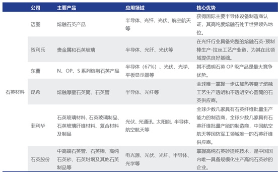 中游石英玻璃材料一般會以錠、筒、棒、管等形態保存,目前產業內主要競爭者包括國外的邁圖、賀利氏、東曹、昆希、以及國內的菲利華、石英股份等。