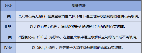 國際學術和工業領域通用的石英玻璃分類方法為按照其制備工藝進行分類。根據制備工藝和性質的不同,通常可以將透明石英玻璃分為以下四類: