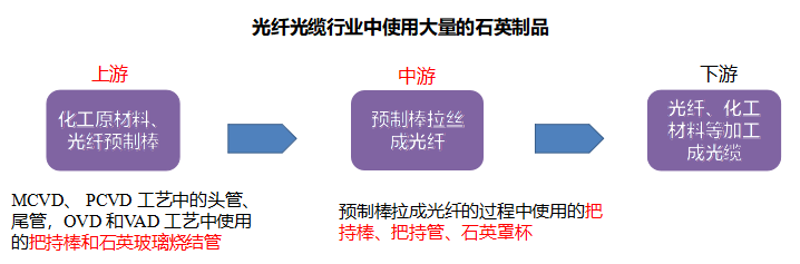 石英玻璃是光纖制造過程中不可或缺的材料。光纖預制棒中 95%以上的組分為高純度的石英玻璃,而在光纖制棒和拉絲等光纖生產過程本身又需要消耗大量的石英玻璃材料。這包括MCVD、PCVD工藝中的頭管、尾管,OVD、VAD工藝中使用的把持棒、石英玻璃燒結管,預制棒拉絲過程使用的把手棒、把手管、石英罩杯等。