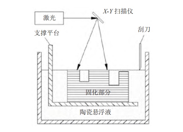 對(duì)于線形直寫(xiě)成型,首先由CAD設(shè)計(jì)三維結(jié)構(gòu)圖形,通過(guò)控制Z軸上的漿料輸送位置,漿料由針嘴擠出的線形流體在X‒Y平臺(tái)成型出第一層結(jié)構(gòu)。第一層結(jié)構(gòu)完成后,Z軸漿料輸送裝置上移至第二層漿料的成型高度,通過(guò)這樣的逐層疊加過(guò)程可獲得傳統(tǒng)成型工藝無(wú)法制備的復(fù)雜精密三維周期結(jié)構(gòu)。與線形直寫(xiě)成型不同的是,液滴直寫(xiě)成型過(guò)程中懸浮液是單個(gè)離散的液滴,而不是連續(xù)的線形流體。液滴直寫(xiě)成型可分為連續(xù)滴定和按需滴定兩類(lèi)。在連續(xù)滴定成型過(guò)程中,連續(xù)的流體懸浮液從噴嘴處噴出單個(gè)離散的液滴,經(jīng)偏轉(zhuǎn)沉積,成型的液滴會(huì)在基底預(yù)先設(shè)計(jì)的位置以溶劑蒸發(fā)、化學(xué)反應(yīng)和冷卻等方式固化。直寫(xiě)成型技術(shù)的主要優(yōu)點(diǎn)是成型過(guò)程無(wú)需模具,生產(chǎn)周期短、效率高、成本低,可根據(jù)需求便捷地改變樣品的形狀和尺寸,生產(chǎn)靈活,控制精確,原材料種類(lèi)多樣化,有無(wú)機(jī)非金屬、金屬和有機(jī)聚合物等。直寫(xiě)成型技術(shù)是制備毫米級(jí)多孔陶瓷的常用方法,主要應(yīng)用于制備刀具、生物、光學(xué)、電子等領(lǐng)域的功能材料。