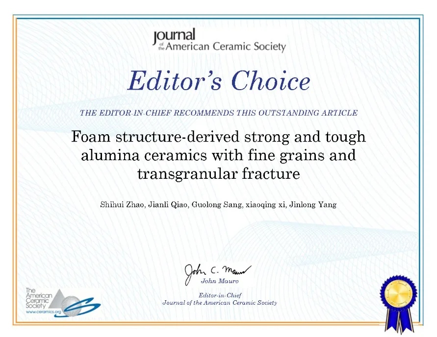 楊金龍教授課題組研究成果獲美國陶瓷學報“Editor’s Choice”獎