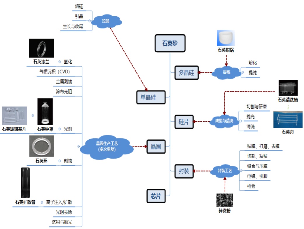 石英制品在下游應用廣泛,產品貫穿集成電路產業的各個環節,以石英砂到芯片的生產過程為例,生產過程將使用到石英坩堝、石英鐘罩、石英擴散管、石英舟、石英玻璃基片等不同類型的產品。半導體領域加工環節在芯片設計流程后,可分為三個階段:單晶硅片制造、晶圓制造和封裝測試。石英材料在半導體產業的應用主要在單晶硅片制造和晶圓制造兩個環節。石英舟、石英管、石英儀器是半導體芯片加工過程清洗、氧化、光刻、刻蝕、擴散等環節中所需要的材料。