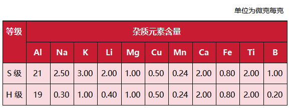 標準級(S級)和高純級(H級)石英舟的雜質元素含量(最大值)