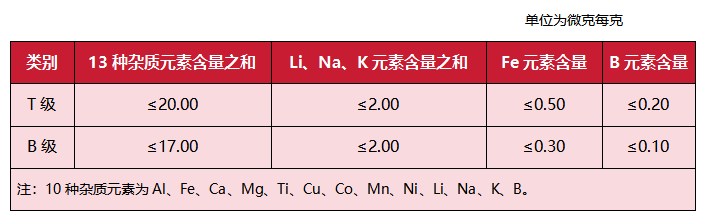 國家標準《GB/T 34178-2017 光掩模石英玻璃基板》中規定了石英玻璃基板中 Al、Fe、Ca、Mg、Ti、Cu、Co、Mn、Ni、Li、Na、K、B等13種雜質元素含量的質量分數總和應不大于2.0μg/g。其中Li、Na、K3種雜質元素含量的質量分數之和應不大于1.0μg/g,單一雜質元素含量的質量分數應不大于0.5g/g。