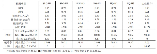 四川石英砂礦石樣品的支撐劑用物理性能測定結果