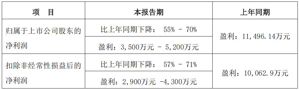 歸屬于上市公司股東的凈利潤約為3,500萬元-5,200萬元,比上年同期下降55%-70%。