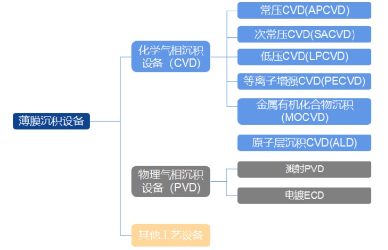 薄膜沉積設備所沉積的薄膜是芯片結構內的功能材料層,在芯片制造過程中需求量巨大,直接影響芯片的性能。不同芯片結構所需要的薄膜材料種類不同、沉積工序不同、性能指標不同,相應產生了巨大的薄膜沉積設備市場。目前主流的薄膜沉積設備有物理氣相沉積(PVD)、化學氣相沉積(CVD)、原子層沉積(ALD)。三種薄膜沉積工藝在沉積原理、沉積材料、適用膜層及工藝等方面存在明顯差異,憑借各自的特性搭配完成集成電路制造流程中的薄膜沉積。