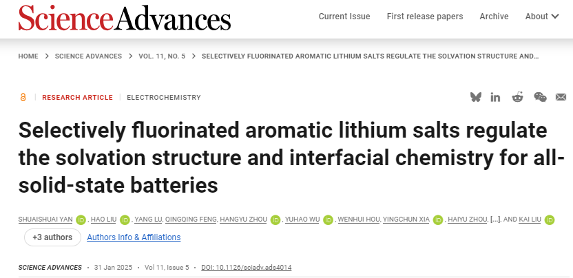 論文第一作者為清華大學化工系2020級博士生閆帥帥,通訊作者為清華大學化工系劉凱副教授。該研究工作得到了北京市自然科學基金、國家自然科學基金的支持。相關成果以“Selectively fluorinated aromatic lithium salts regulate the solvation structure and interfacial chemistry for all-solid-state batteries”為題發表在學術期刊《Science Advances》上。