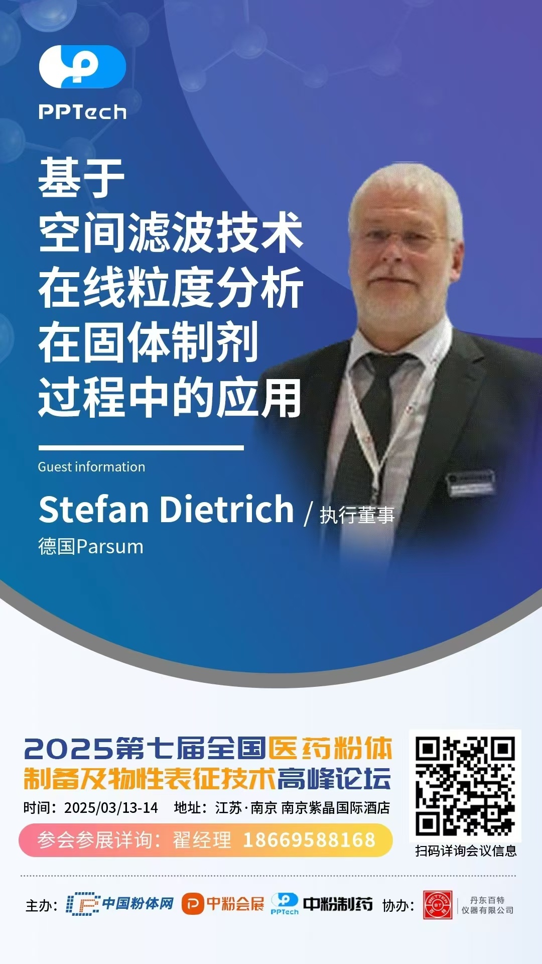 以“從粉體技術(shù),論制藥工藝”為主題,2025年3月13-14日中國粉體網(wǎng)將在江蘇南京紫晶國際酒店舉辦“2025第七屆全國醫(yī)藥粉體制備及物性表征技術(shù)高峰論壇”。屆時來自德國Parsum公司的執(zhí)行董事Stefan Dietrich博士為大家?guī)怼?span style="color: rgb(255, 0, 0);">基于空間濾波技術(shù)在線粒度分析在固體制劑過程中的應(yīng)用》的主題報告。報告主講人將用實際數(shù)據(jù),展示在線粒度分析在各種造粒設(shè)備上應(yīng)用的重要性和先進性。尤其是在一步制粒或全自動連續(xù)造粒上,在線粒度分析的重要性。