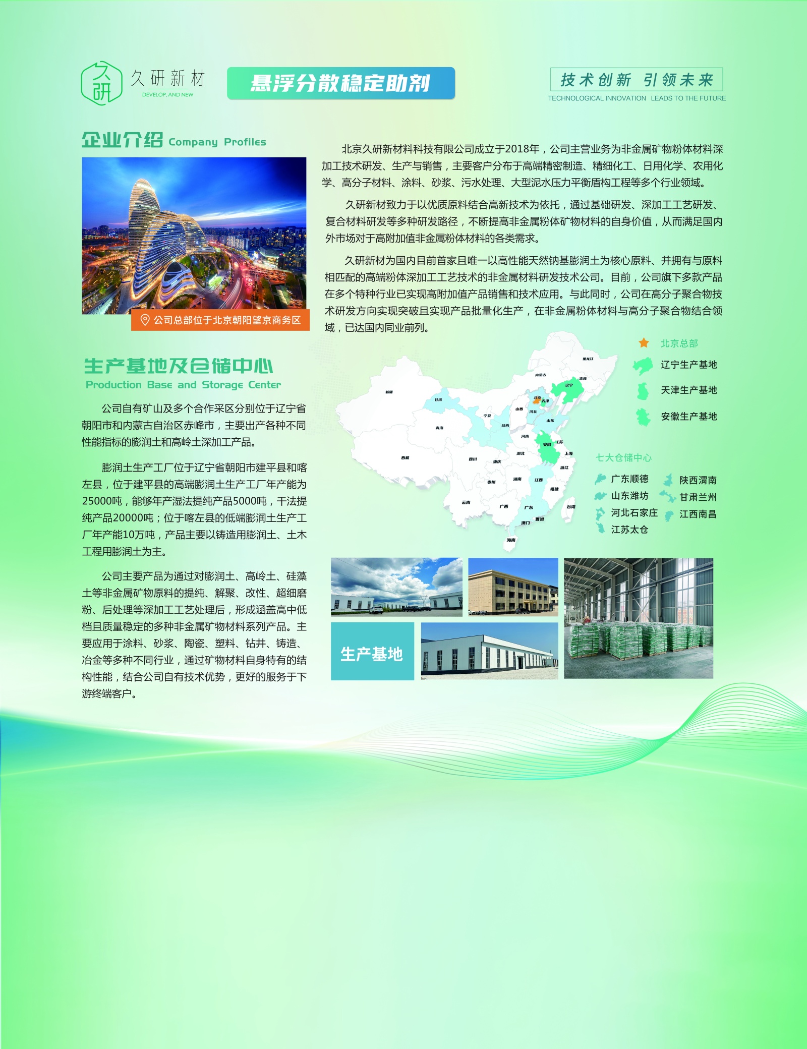 北京久研新材料科技有限公司成立于2018年,公司主營業務為非金屬礦物粉體材料深加工技術研發、生產與銷售,主要客戶分布于高端精密制造、精細化工、日用化學、農用化學、高分子材料、涂料、砂漿、污水處理、大型泥水壓力平衡盾構工程等多個行業領域。