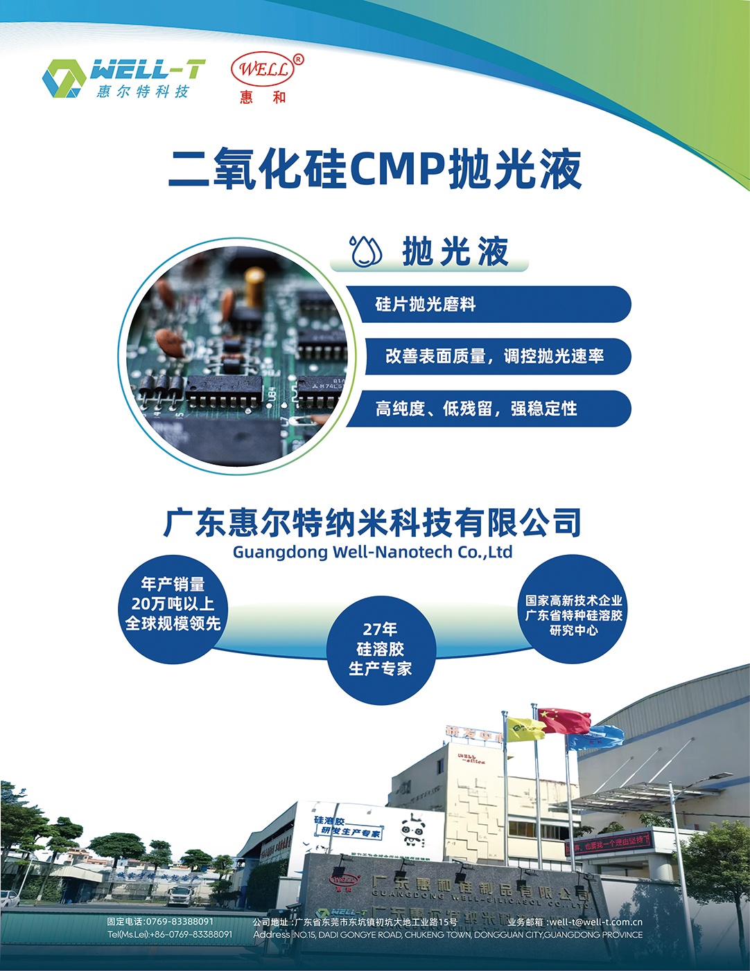 二氧化硅(SiO2)含量30%50%,粒徑分布為20 nm160 nm,用于硅、鍺元素半導(dǎo)體以及砷化鎵、碲鋅鎘、磷化銦等化合物半導(dǎo)體粗拋、精拋過程,拋光速率高,拋光一致性好。