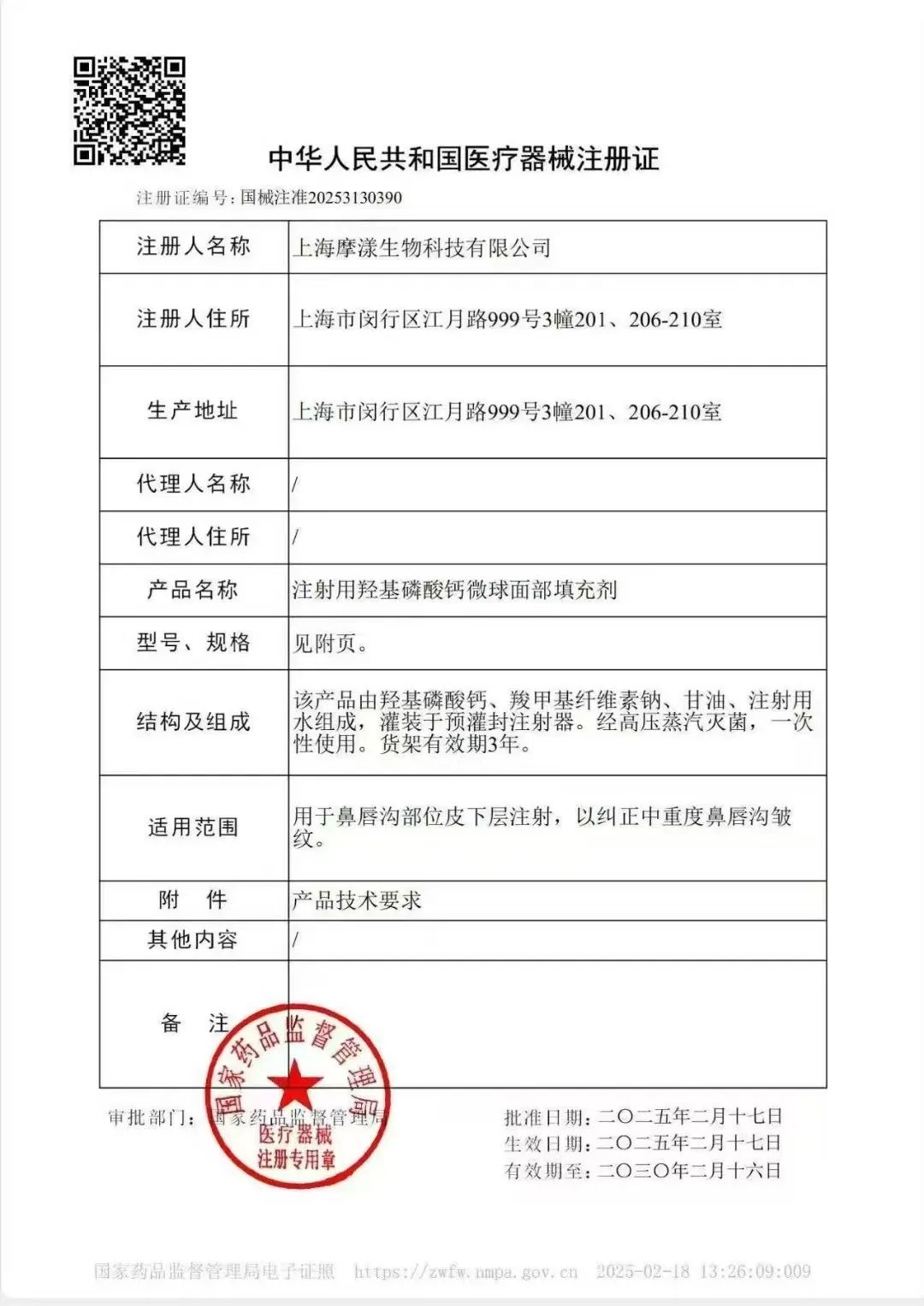 該產品的注冊編號為國械注準20253130390。證件信息顯示,其適用范圍為鼻唇溝部位皮下層注射,用于糾正中重度鼻唇溝皺紋。產品結構組成包括羥基磷酸鈣、羧甲基纖維素鈉、甘油和注射用水,且采用預灌封注射器進行罐裝。