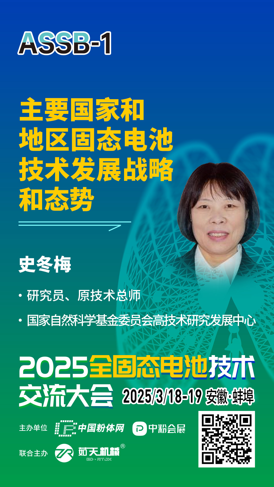 針對固態電池相關的技術、材料、市場及產業等方面的問題,中國粉體網將于2025年3月18-19日在安徽·蚌埠舉辦2025全固態電池技術交流大會暨第一屆干法電極技術研討會。為致力于固態電池技術開發的企業,科研院校,以及新能源汽車、儲能、消費電子等終端企業提供信息交流的平臺,開展產、學、研合作,助推固態電池產業化發展。屆時,國家自然科學基金委員會高技術研究發展中心史冬梅研究員將作題為《主要國家和地區固態電池技術發展戰略和態勢》的報告。