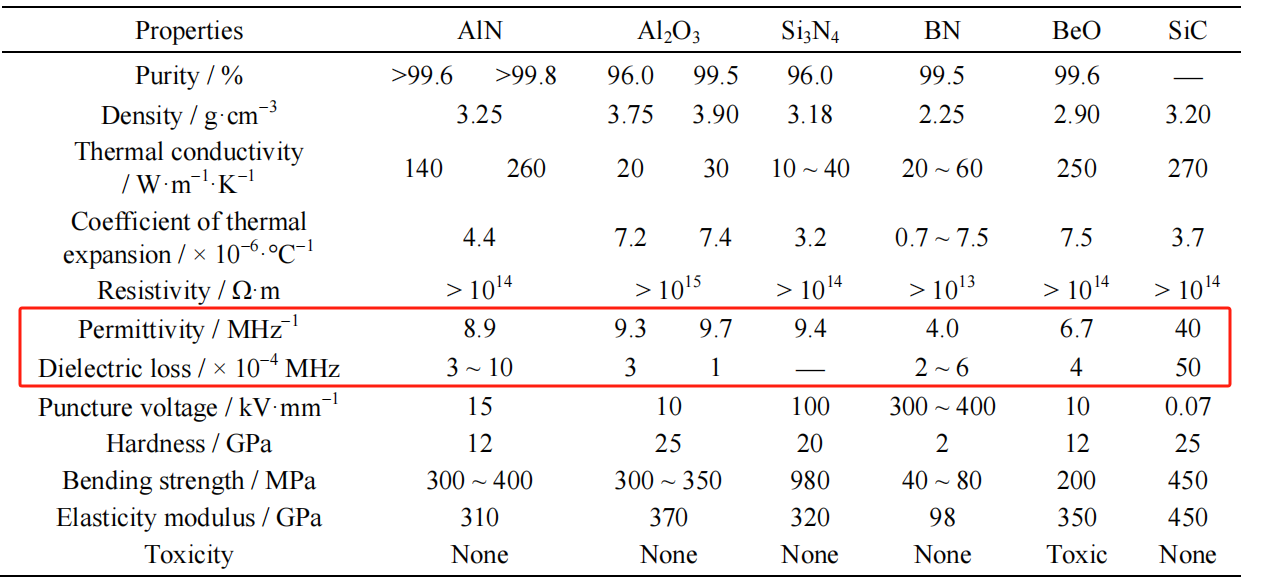 看得出來,像導熱填料一樣,陶瓷基板同樣對材料的介電性能有一定的要求,相對于其它陶瓷材料而言,碳化硅陶瓷相對介電常數為40,是AlN陶瓷的4倍,會導致信號延遲,影響產品的可靠性,限制了其高頻應用。此外,其不良的絕緣耐壓性也阻礙了其在散熱基板領域的應用。
