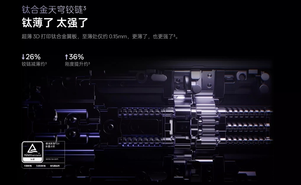 OPPO Find N5的「鈦合金天穹鉸鏈」是粉末冶金與增材制造結合的重要成果。其采用選區激光熔化(SLM)技術,通過1700℃高溫將鈦合金粉末熔化為液態,逐層堆疊成型,精度達±0.02毫米,最薄零件僅0.15mm。該技術突破傳統CNC加工限制,實現復雜空腔結構設計,鉸鏈整體減薄26%的同時,剛性提升36%。