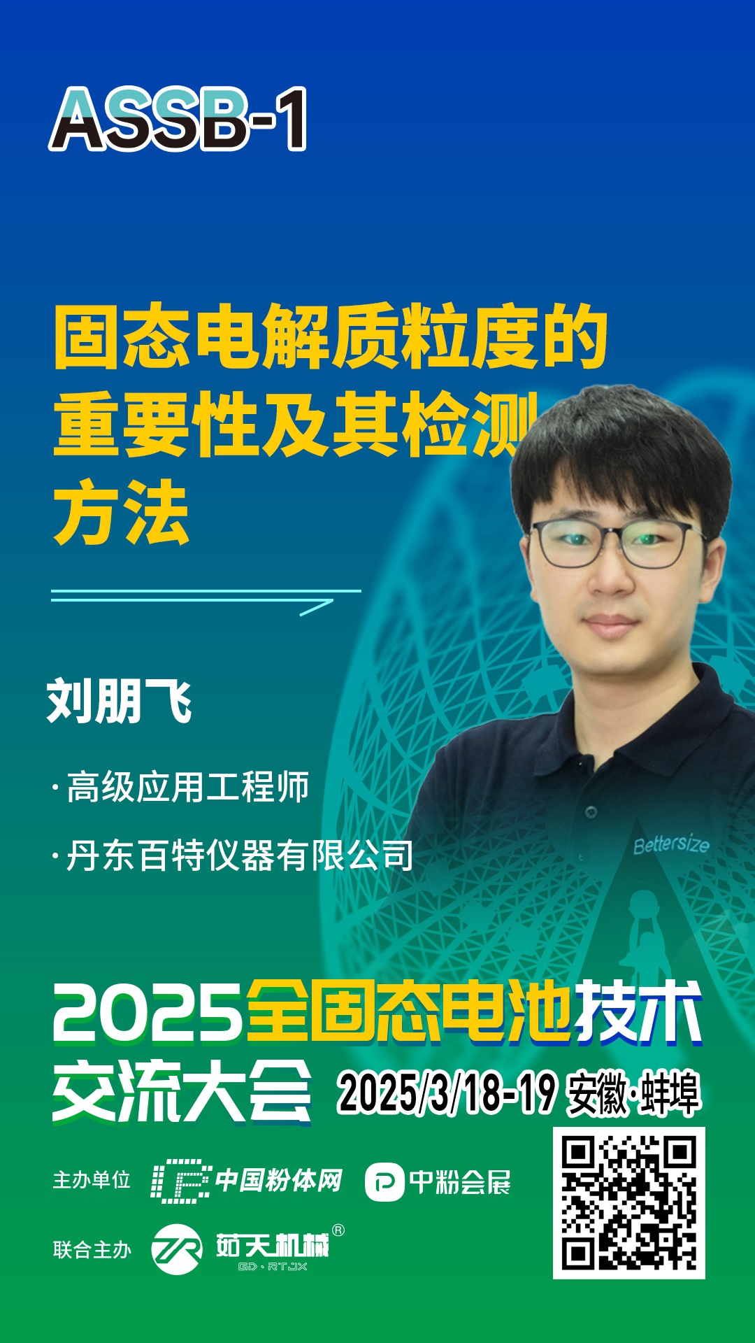 針對固態電池相關的技術、材料、市場及產業等方面的問題,中國粉體網將于2025年3月18-19日在安徽·蚌埠舉辦2025全固態電池技術交流大會暨第一屆干法電極技術研討會。為致力于固態電池技術開發的企業,科研院校,以及新能源汽車、儲能、消費電子等終端企業提供信息交流的平臺,開展產、學、研合作,助推固態電池產業化發展。屆時,丹東百特儀器有限公司高級應用工程師劉朋飛將作題為《固態電解質粒度的重要性及其檢測方法》的報告。報告重點介紹激光衍射法在硫化物、氧化物等固態電解質粒度分析中的應用。