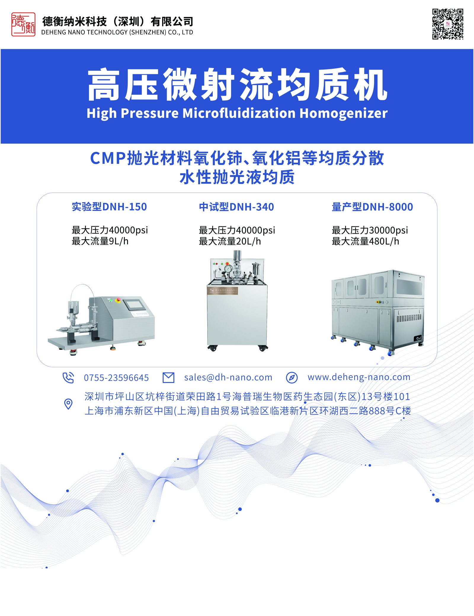 德衡納米科技(深圳)有限公司,是專業(yè)研發(fā)及生產(chǎn)微射流均質(zhì)機(jī)的本土企業(yè)。主營設(shè)備包含實(shí)驗(yàn)型、中試型、量產(chǎn)型、防爆型與醫(yī)藥型等多種型號(hào)的微射流均質(zhì)機(jī)。