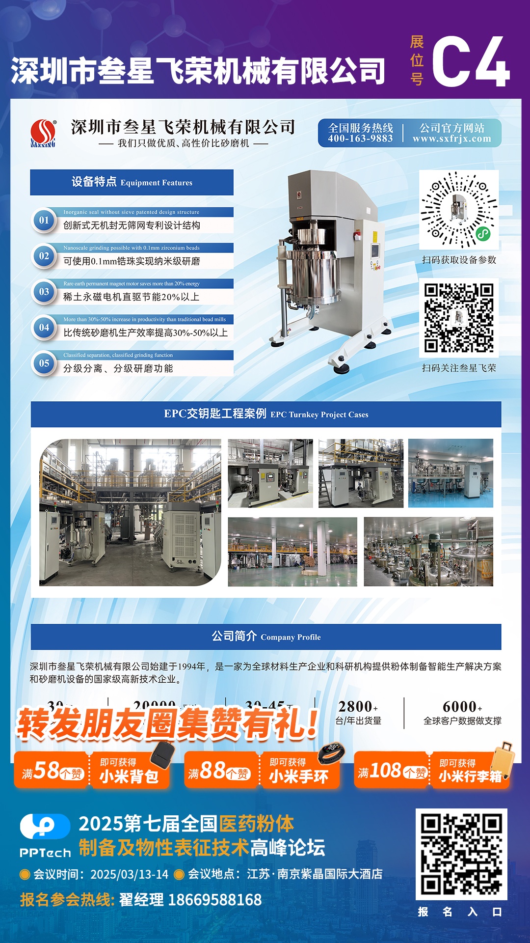 從第七屆全國醫藥粉體制備及物性表征技術高峰論壇組委會獲悉,本屆會議將于2025年3月13-14日在南京舉辦。深圳市叁星飛榮機械有限公司作為參展單位邀請您共同出席。