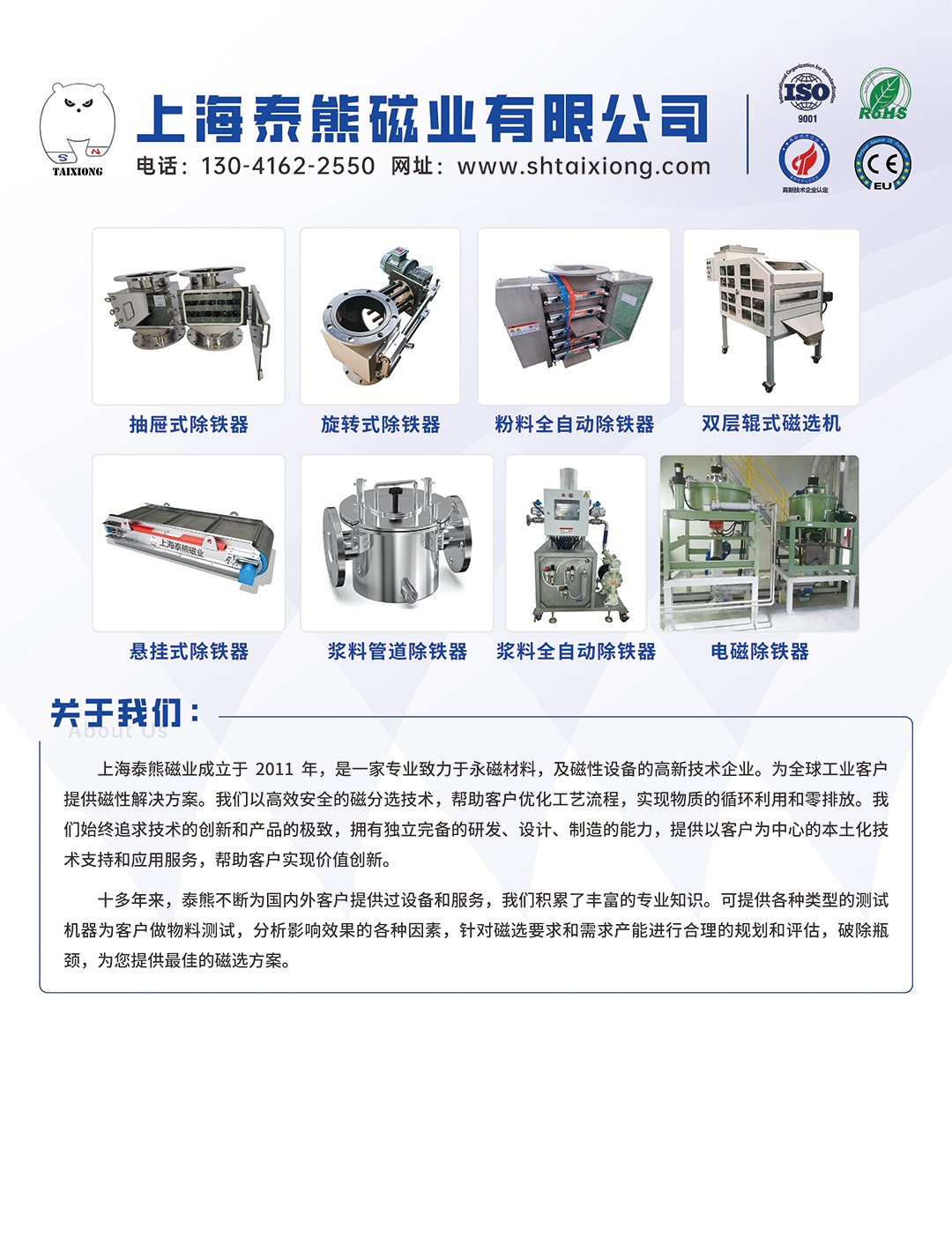 上海泰熊磁業有限公司是專業從事磁性材料的研發、生產、加工、銷售為一體的生產型企業。經過多年的市場歷練,泰熊已經在磁性事業上踏上了新的征程。公司產品跨四大領域十四大系列,從橡膠磁材到受磁材料,逐步擴展到磁性廣告材料、磁性制品等領域,從片狀膠磁、卷狀膠磁系列到磁性漆、電梯磁、磁性廣告、冰箱貼磁等系列。 公司通過不斷的引進專業人才和先進技術 ,與國內外朋友廣泛合作,共同研制、開發生產,滿足廣大用戶的需求。產品已經深受國內外市場客戶的青睞。在客戶中樹立了良好的口碑形象。