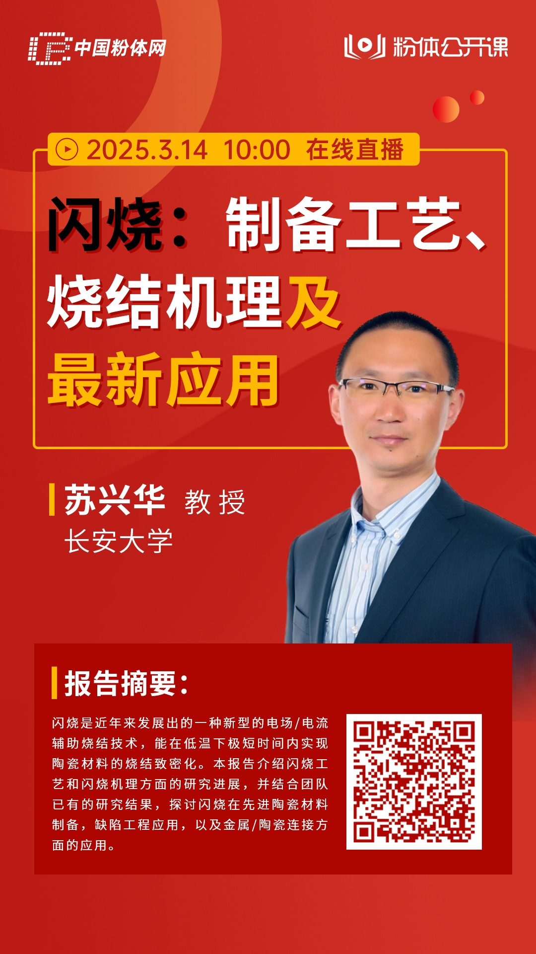粉體公開課特邀長安大學蘇興華教授于3月14日早10點,帶來精彩直播課程:閃燒:制備工藝、燒結機理及最新應用,歡迎大家掃碼預約觀看!