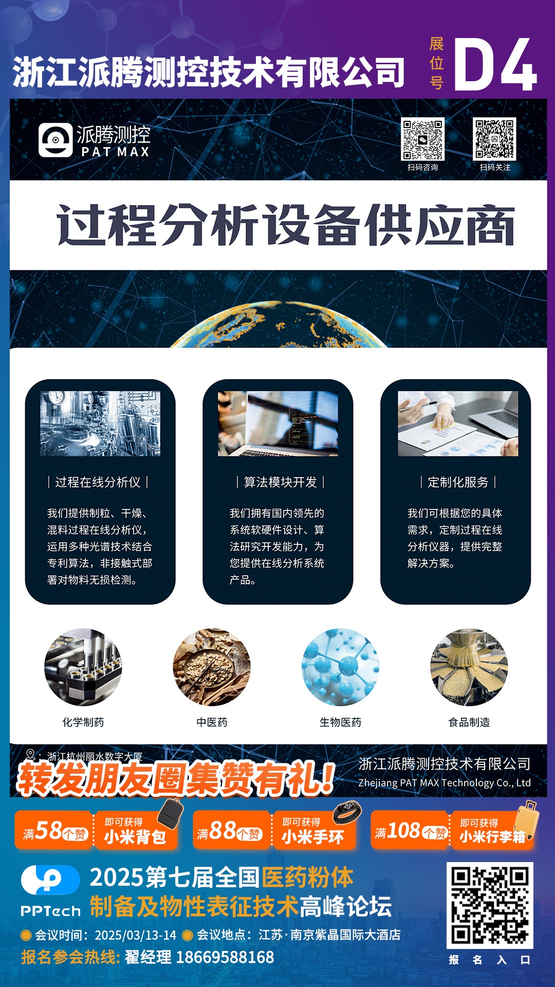 從第七屆全國醫藥粉體制備及物性表征技術高峰論壇組委會獲悉,本屆會議將于2025年3月13-14日在南京舉辦。浙江派騰測控技術有限公司作為參展單位邀請您共同出席。