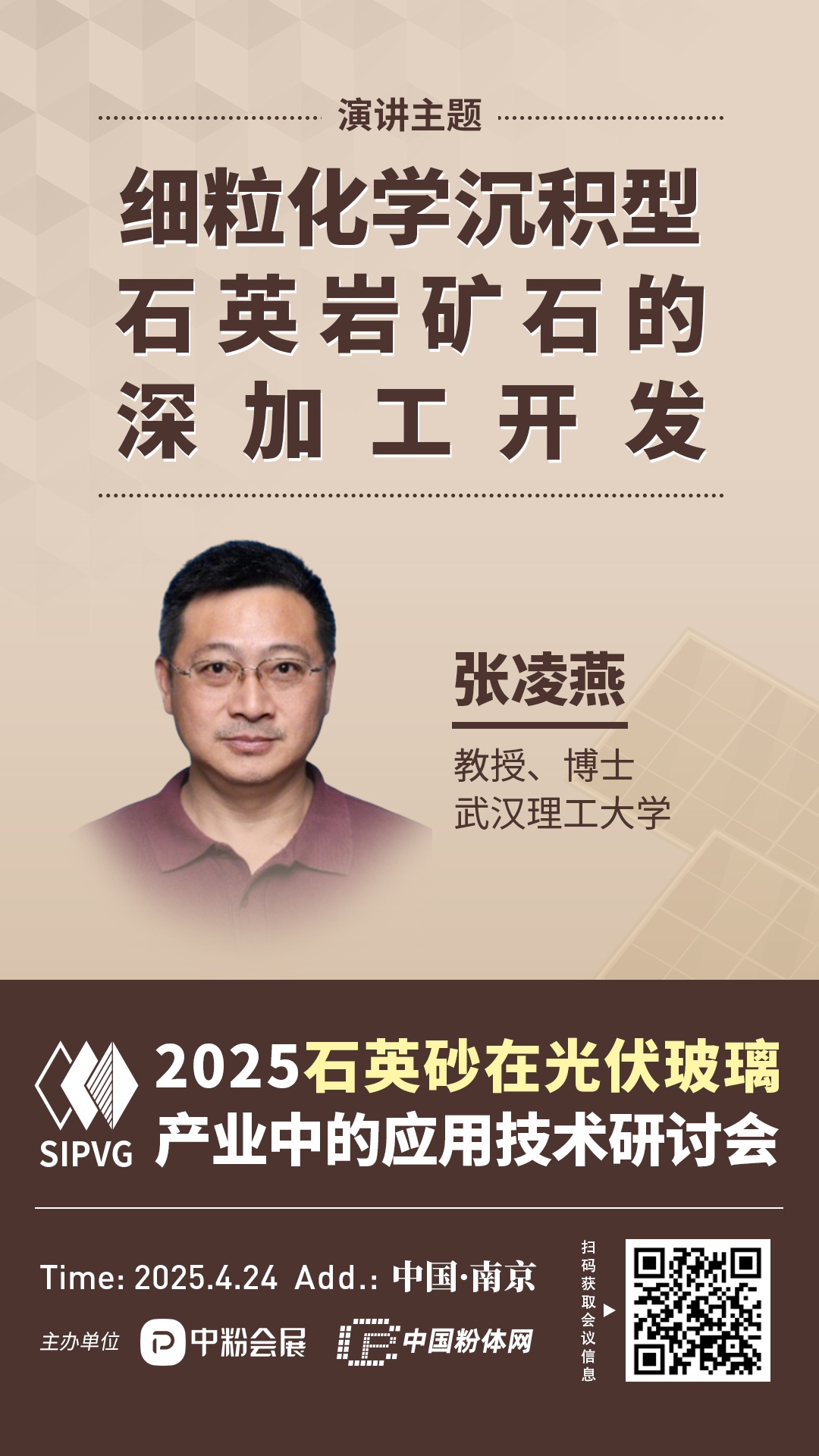 2025年4月24日,由中國粉體網(wǎng)、中粉會展主辦的“2025石英砂在光伏玻璃產(chǎn)業(yè)中的應(yīng)用技術(shù)研討會”將在江蘇南京召開,屆時來自武漢理工大學(xué)的張凌燕教授,將做題為《細(xì)粒化學(xué)沉積型石英巖礦石的深加工開發(fā)》的報告。