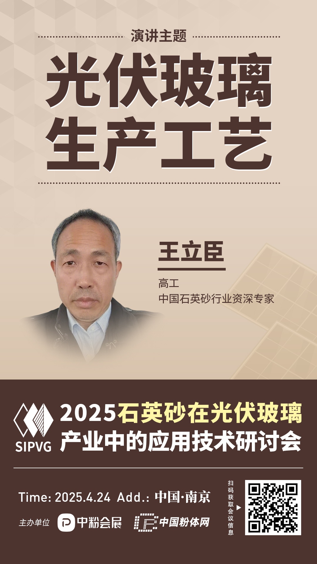 2025年4月24日,由中國粉體網、中粉會展主辦的“2025石英砂在光伏玻璃產業中的應用技術研討會”將在江蘇南京召開,屆時中國石英砂行業資深專家王立臣高工將做題為《光伏玻璃生產工藝》的報告。
