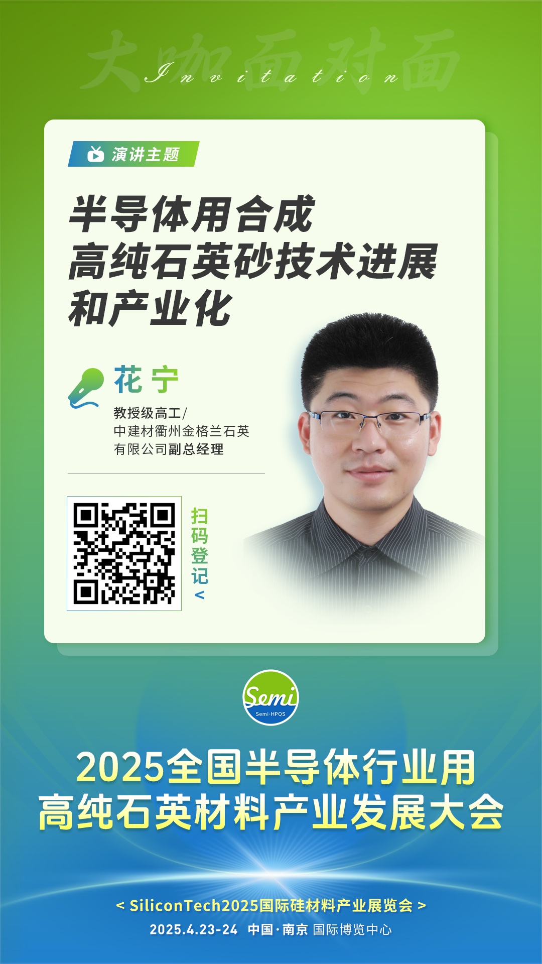 2025年4月23-24日,由中國粉體網、中粉會展主辦的“2025全國半導體行業用高純石英材料產業發展大會”將在江蘇南京召開,屆時來自中建材衢州金格蘭石英有限公司的教授級高工、副總經理花寧將做題為《半導體用合成高純石英砂技術進展和產業化》的報告。