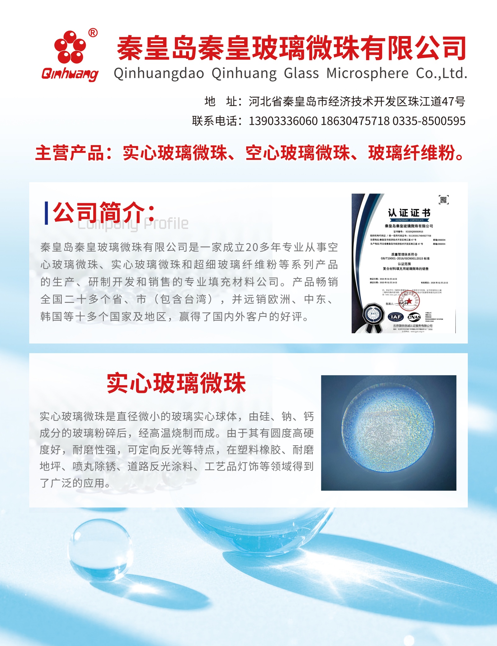 秦皇島秦皇玻璃微珠有限公司是一家成立20多年專業從事空心玻璃微珠、實心玻璃微珠和超細玻璃纖維粉等系列產品的生產、研制開發和銷售的專業填充材料公司。產品暢銷全國二十多個省、市(包含臺灣),并遠銷歐洲、中東、韓國等十多個國家及地區,贏得了國內外客戶的好評。