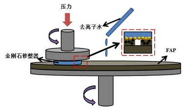 在CMP過程中,由于拋光墊表面經(jīng)歷載荷以及剪切力作用,會誘發(fā)拋光墊表面凸起發(fā)生塑性流動并趨于平面化,即釉化現(xiàn)象。拋光墊的修整可以改善拋光墊表面釉化和多孔性,維持穩(wěn)定的拋光性能。