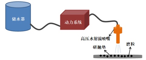 高壓水射流修整技術原理是利用水射流沖擊產(chǎn)生的剪切力,不僅可以使拋光墊表面松動或固結(jié)不好的磨料顆粒沖洗掉,而且會破壞拋光墊表面的“釉化”層,清除雜質(zhì),提高拋光墊的加工性能。高壓水射流修整拋光墊工作示意圖如圖所示。