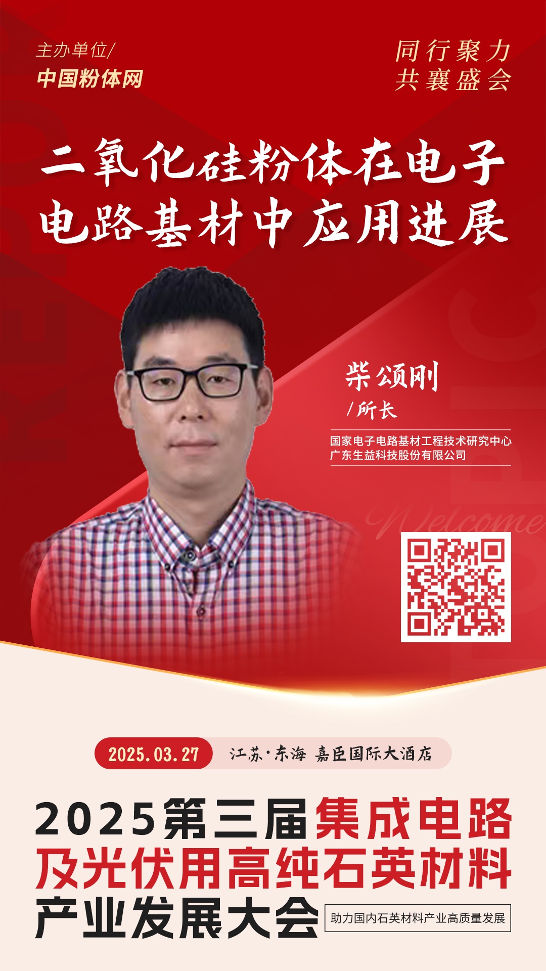 2025年3月27日,由中國粉體網主辦的“2025第三屆集成電路及光伏用高純石英材料產業發展大會”將在江蘇東海召開,來自國家電子電路基材工程技術研究中心、廣東生益科技股份有限公司的柴頌剛所長,將做題為《二氧化硅粉體在電子電路基材中應用進展》的報告。