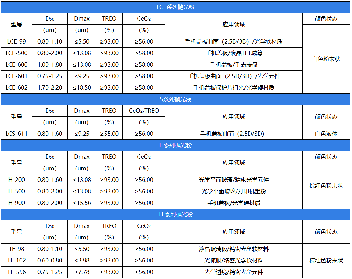 公司已先后通過(guò)了ISO9001質(zhì)量管理體系認(rèn)證,ISO14001環(huán)境管理體系認(rèn)證,ISO45001職業(yè)健康安全管理體系認(rèn)證,ISO50001能源管理體系認(rèn)證,具備9000噸/年的稀土拋光粉生產(chǎn)能力,已形成5個(gè)系列40余種規(guī)格型號(hào)的產(chǎn)品規(guī)格,被廣泛應(yīng)用于液晶玻璃、硬盤(pán)玻璃基板、光掩膜、水晶水鉆飾品等領(lǐng)域,產(chǎn)品粒度均一、品質(zhì)穩(wěn)定、拋光速度快。