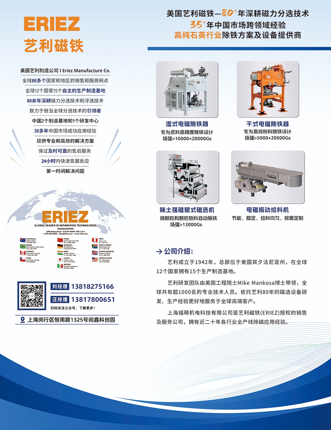 上海福萌機電科技有限公司(FOREMOST)是藝利磁鐵(ERIEZ Magnetics)國內銷售及服務公司,位于上海閔行區漕河涇,專業銷售高端磁選機,除鐵器,振動給料機,金屬探測器,渦流分選機及磁力自動化等先進設備。80多年來積累的行業經驗為客戶提供磁選,物料輸送及金屬分選的全產線專業解決方案。