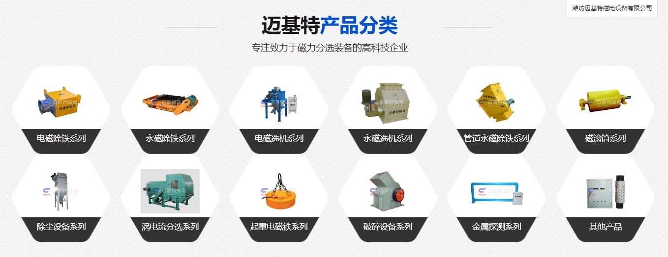 濰坊邁基特磁電設備有限公司始建于2006年,是國內大規模的致力于磁力分選裝備的企業,公司集科研開發、工程設計、生產安裝、調試服務于一體。主要產品有:電磁除鐵器、永磁除鐵器、磁選機、磁滾筒、起重電磁鐵、粉料除鐵器、漿料除鐵器、金屬探測儀、除塵設備、環保設備、破碎設備、給料機等十幾個系列六百多個規格,產品銷往全國各地并出口美國、歐盟、巴基斯坦、越南、新加坡、馬來西亞、埃及、等幾十個國家和地區,遍布冶金、電力、水泥、化工、礦山、煤炭、建材、玻璃、陶瓷、耐火材料、食品等行業,并可為用戶進行特殊設計和制造。