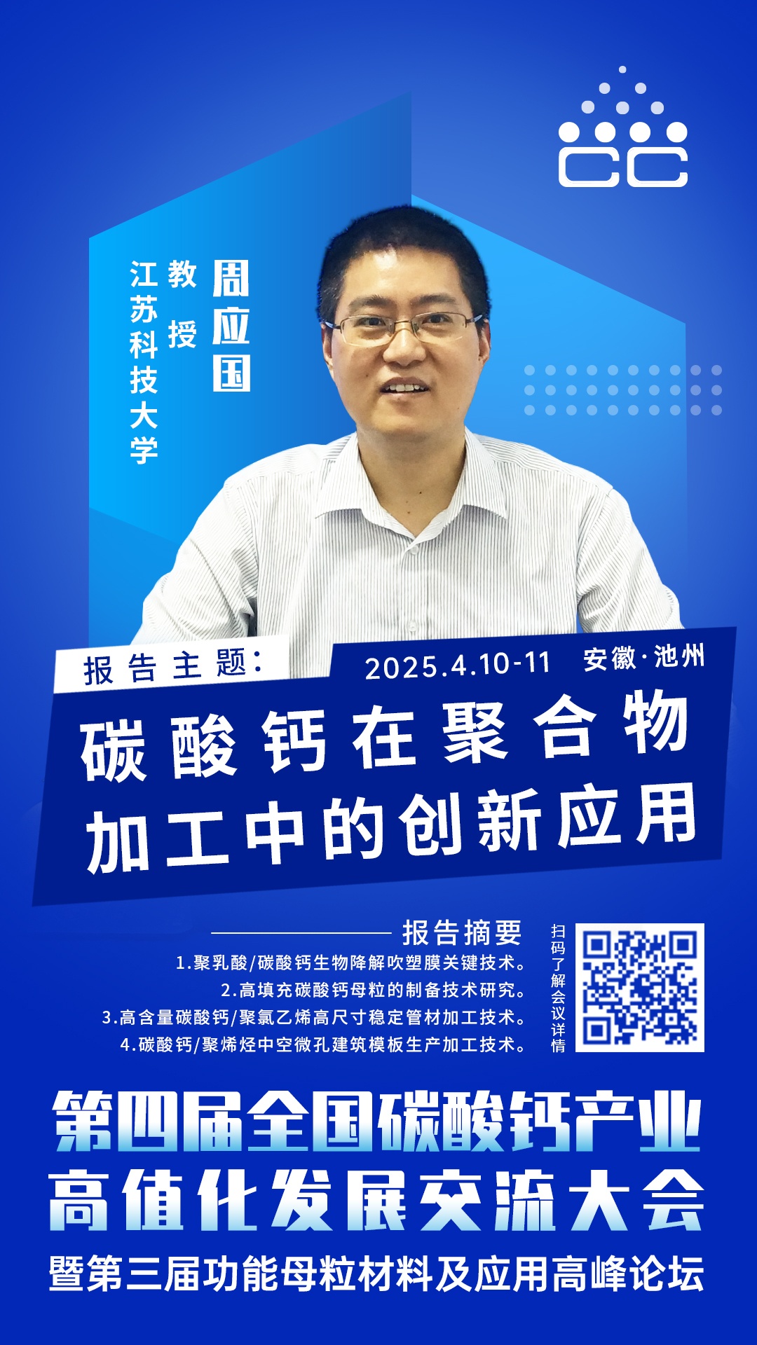 2025年4月10-11日,由中國粉體網主辦的第四屆全國碳酸鈣產業高值化發展交流大會將在安徽·池州舉行,屆時江蘇科技大學周應國教授將在大會上作《碳酸鈣在聚合物加工中的創新應用》主題報告,介紹碳酸鈣和聚合物加工技術相關的創新案例,揭示碳酸鈣對聚合物性能提升的巨大價值。