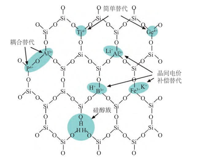石英中晶體結構雜質分為晶格雜質和非晶格雜質。晶格雜質主要以他類原子以類質同象的方式取代硅氧四面體中的硅原子,主要雜質元素有Al3+、Ti4+、Ge4+等。其中,微量元素替代石英中的硅原子主要有三種方式:(1)等價替代,如Ti4+、Ge4+替代Si4+;(2)離子團替代,如Al3+與P5+或Al3+與Na+替代Si4+;(3)電荷補償替代,如Al3+、Fe3+所形成的[AlO4/M+]0或[FeO4/M+]0結構中心。由于Al3+和Si4+半徑相近,Al3+替代硅原子最為常見,Al3+替代Si4+后為了達到電荷平衡,首先由正一價堿金屬離子(如Li+、Na+、K+)以及H+來補償,如果堿金屬離子不足,有時用正二價的Ca2+、Mg2+離子及部分過渡金屬離子來補償,從而堿金屬離子(如Li+、Na+、K+)以及H+等可作為電荷補償離子進入石英晶格而賦存于石英晶格間隙中,因此可以通過石英中Al的含量判斷石英原料的質量。