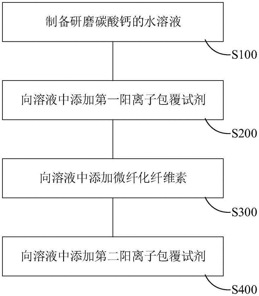 造紙填料的制備方法包括:制備研磨碳酸鈣的水溶液;向溶液中添加第一陽離子包覆試劑;向溶液中添加微纖化纖維素;向溶液中添加第二陽離子包覆試劑。采用一種三元包覆技術將填料進行預絮聚(分別是首先加入第一陽離子包覆試劑,然后加入微纖化纖維素,以及最后加入第二陽離子包覆試劑),可以大幅提高填料的保留率和紙頁強度,另外還可以降低微纖化纖維素的多羥基特性對紙頁濾水帶來的影響,充分發揮纖維間羥基結合作用。