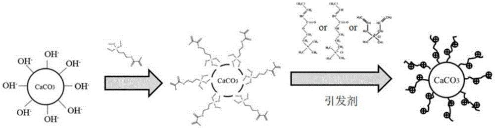 先將碳酸鈣粉體與硅烷偶聯劑混合改性處理,利用硅氧鍵水解與碳酸鈣表面的羥基反應形成Si-O-Si共價鍵,在碳酸鈣表面引入C=C鍵。然后再將表面帶有雙鍵的碳酸鈣與季銨鹽單體混合,通過引發劑引發聚合反應,獲得表面帶有季銨鹽陽離子基團的改性碳酸鈣材料。由于季銨鹽陽離子表面改性的碳酸鈣材料表面帶有季銨陽離子基團,使得碳酸鈣與表面帶負電荷的紙纖維能更好地結合,從而提高造紙過程中的紙漿留著率,增強紙張的機械強度,降低造紙白水中的纖維和填料含量。