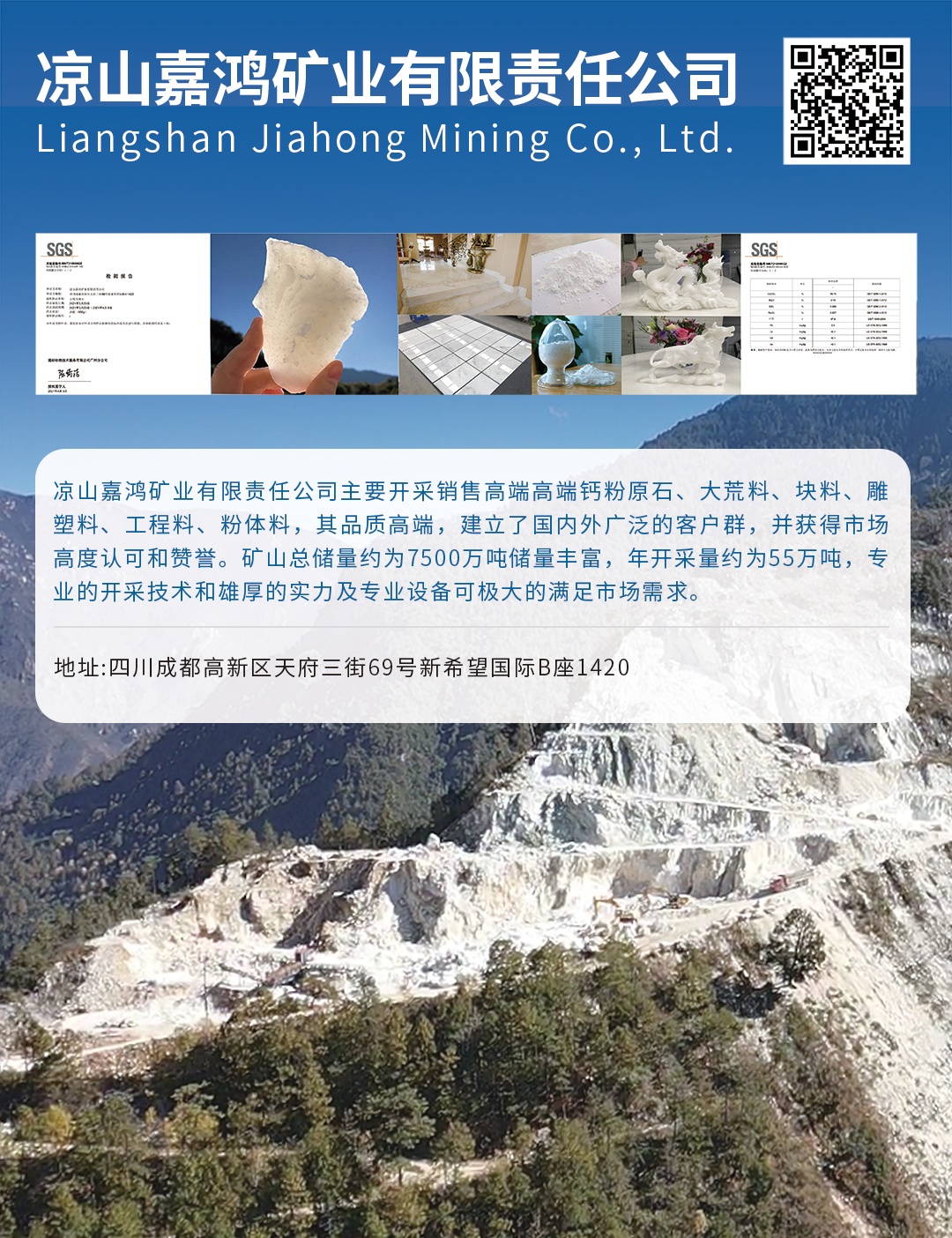 涼山嘉鴻礦業有限責任公司主要開采銷售高端高端鈣粉原石、大荒料、塊料、雕塑料、工程料、粉體料,其品質高端,建立了國內外廣泛的客戶群,并獲得市場高度認可和贊譽。礦山總儲量約為7500萬噸儲量豐富,年開采量約為55萬噸,專業的開采技術和雄厚的實力及專業設備可極大的滿足市場需求。