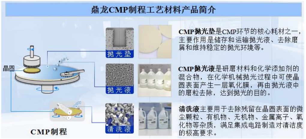 鼎龍股份致力于為下游晶圓廠客戶提供整套的一站式CMP核心材料及服務,持續提升系統化的CMP環節產品支持能力、技術服務能力、整體方案解決能力,努力成為國內首家也是唯一一家集成電路CMP環節全產品綜合性方案提供商。