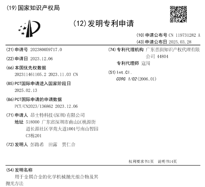 中國粉體網(wǎng)訊 近日,國家知識(shí)產(chǎn)權(quán)局信息顯示,昂士特科技(深圳)有限公司(以下簡(jiǎn)稱“昂士特”)取得一項(xiàng)名為“一種用于金屬合金的化學(xué)機(jī)械拋光組合物及其拋光方法”的專利,無腐蝕拋光設(shè)備中的金屬部件的風(fēng)險(xiǎn)。