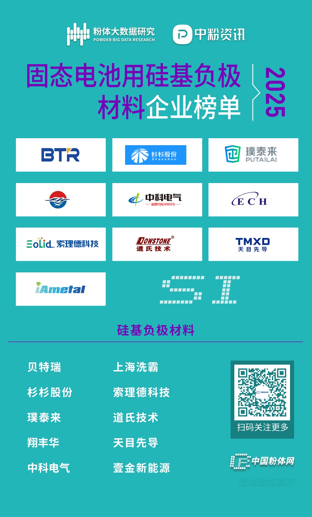 依據各企業官網、官微及行業公開信息等,2025年國內十大固態電池用硅基負極材料企業為貝特瑞、杉杉股份、璞泰來、翔豐華、中科電氣、上海洗霸、索理德科技、道氏技術、天目先導、壹金新能源。