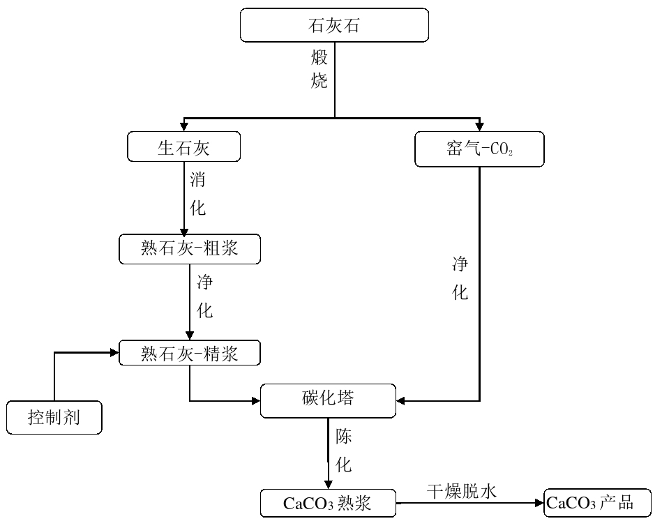碳化法通過控制氫氧化鈣濃度、反應溫度和窯氣中的二氧化碳濃度、氣液比、添加劑種類及數量等工藝條件,可制取不同形貌不同粒徑的納米級碳酸鈣,如立方形、圓形、紡錘狀、鏈鎖形、花型等。