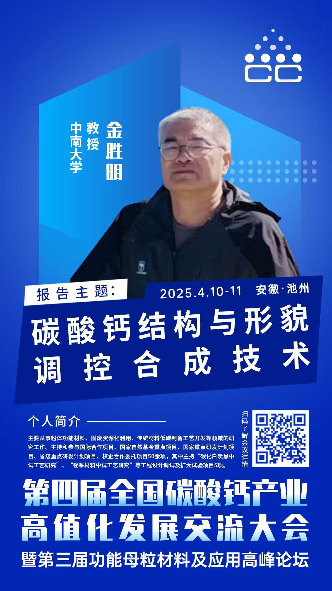 2025年4月10-11日,由中國粉體網主辦的第四屆全國碳酸鈣產業高值化發展交流大會將在安徽·池州舉行,屆時中南大學金勝明教授將在大會上作《碳酸鈣結構與形貌調控合成技術》主題報告,根據碳化法等主流工藝,分析不同形貌碳酸鈣制備技術和應用優勢,講解工藝控制和晶型控制的要點。