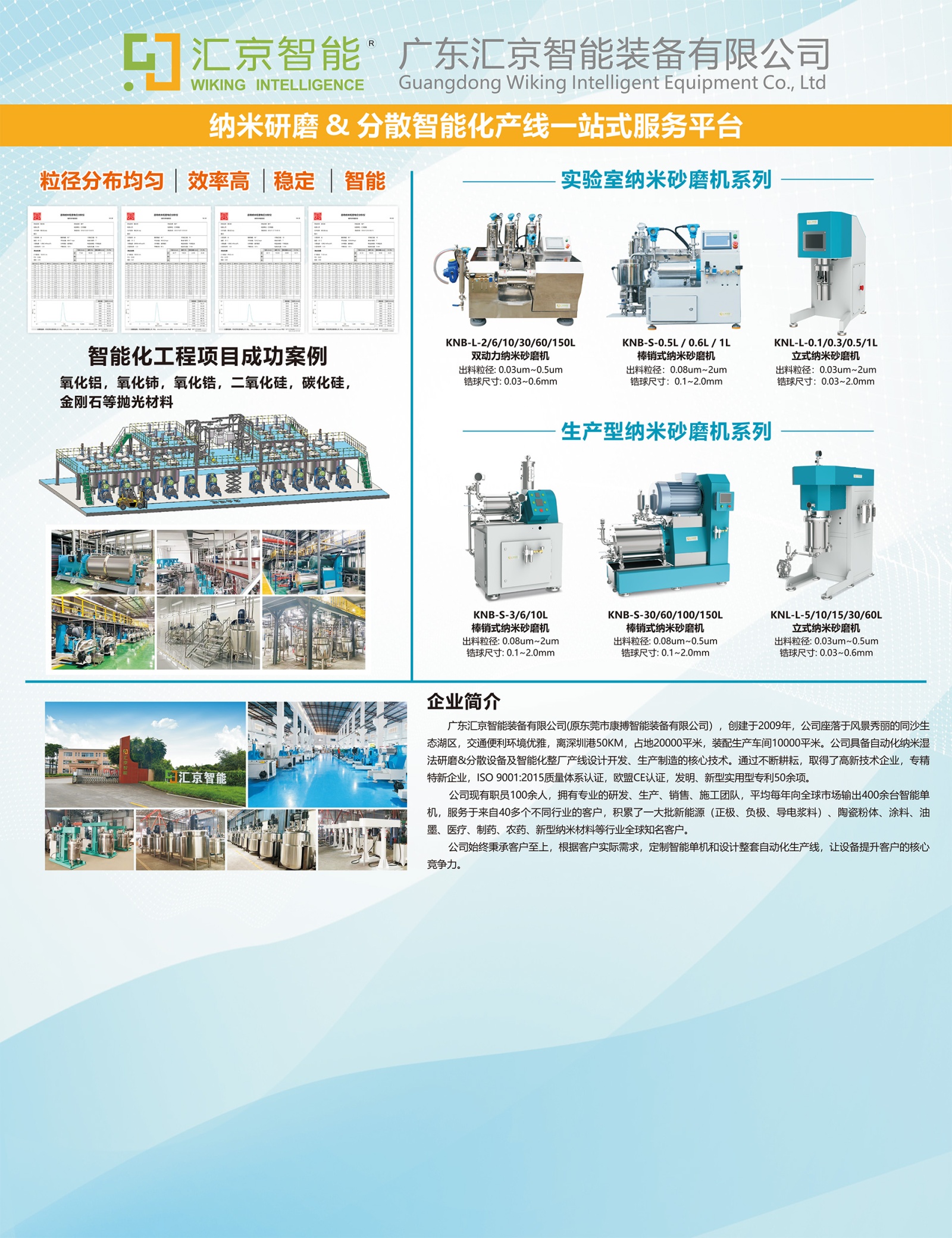 廣東匯京智能裝備有限公司(原東莞市康搏智能裝備有限公司),創建于2009年,公司座落于風景秀麗的同沙生態湖區,交通便利環境優雅,離深圳港50KM,占地20000平米,裝配生產車間10000平米。公司具備自動化納米濕法研磨&分散設備及智能化整廠產線設計開發、生產制造的核心技術。通過不斷耕耘,取得了高新技術企業,專精特新企業,ISO9001:2015質量體系認證,歐盟CE認證,發明、新型實用型專利50余項。
