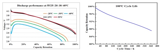 第二代固態電池同時還具備“寬溫域”的優異特性。該固態電池可在-40℃~100℃時放電使用,-20℃放電效率>85%,-40℃放電效率>75%。同時,該固態電池還可以在100℃高溫環境下安全連續進行充、放電循環,360小時后仍有88%的容量保持率,使用溫域橫跨140℃。基于此特性,第二代固態電池可在極寒、高溫等極端環境下平穩使用。